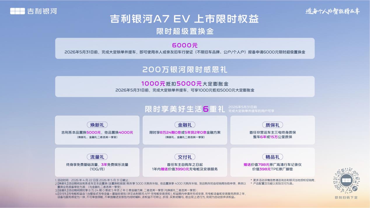 即日起,用户可通过吉利银河APP、小程序、抖音小程序及官网等官方渠道下定。凡在2026年5月31日前下定2026款吉利银河A7 EM的用户,可享受5000元超级置换金及1000元抵4000元膨胀金。