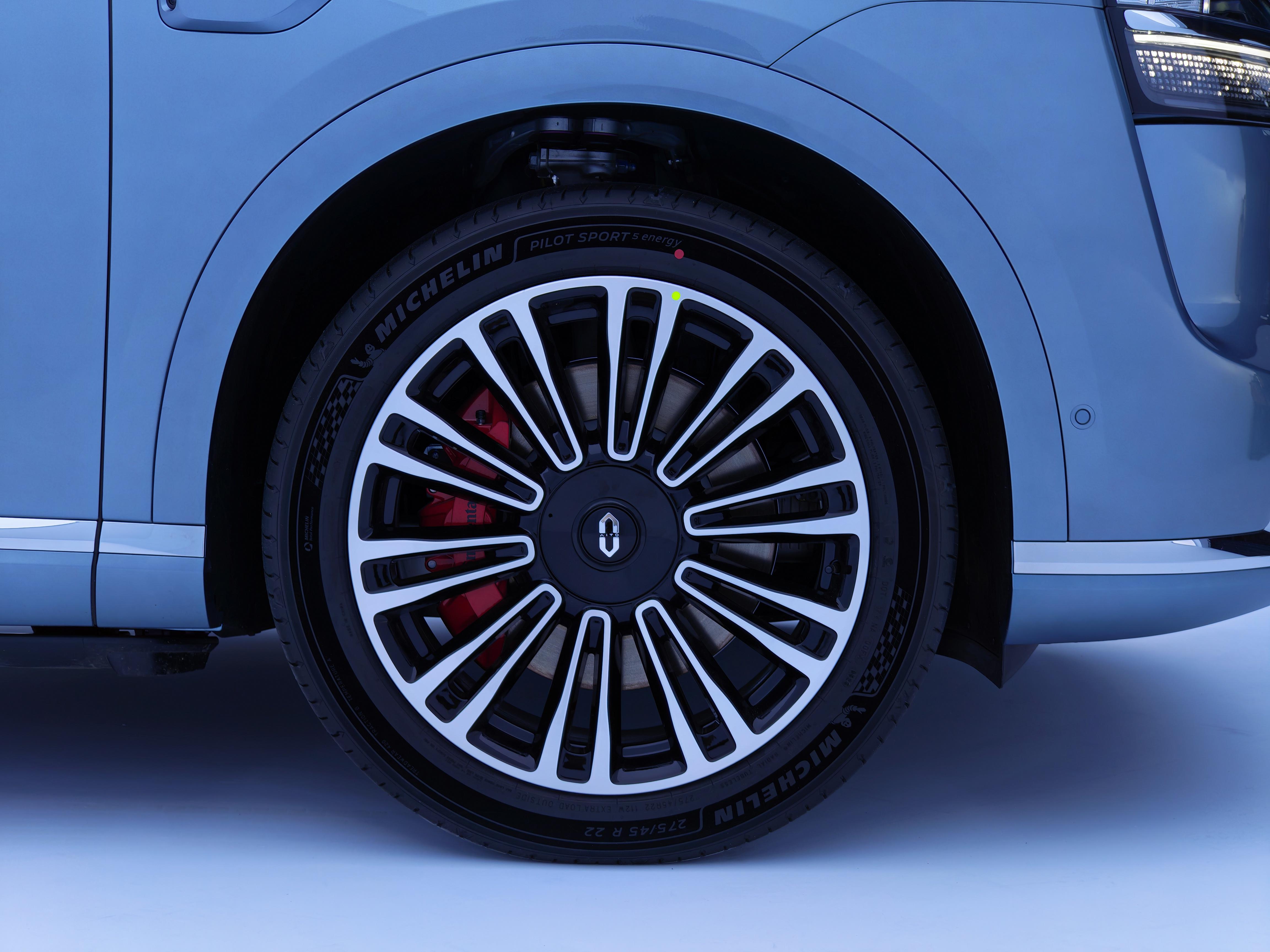 为了匹配更大的车身与动力,新车在行走机构上提供了丰富的选项。轮胎采用前后规格差异化设计,标配21寸轮胎,前265/后285,并提供22寸轮胎可选。官方共推出6款轮毂样式,包含21寸多幅星辉、21寸大七幅运动、22寸多幅星芒、22寸星芒黑曜、22寸双十幅星脉,以及辨识度极高的22寸11孔月辉轮毂,也就是大饼轮毂。