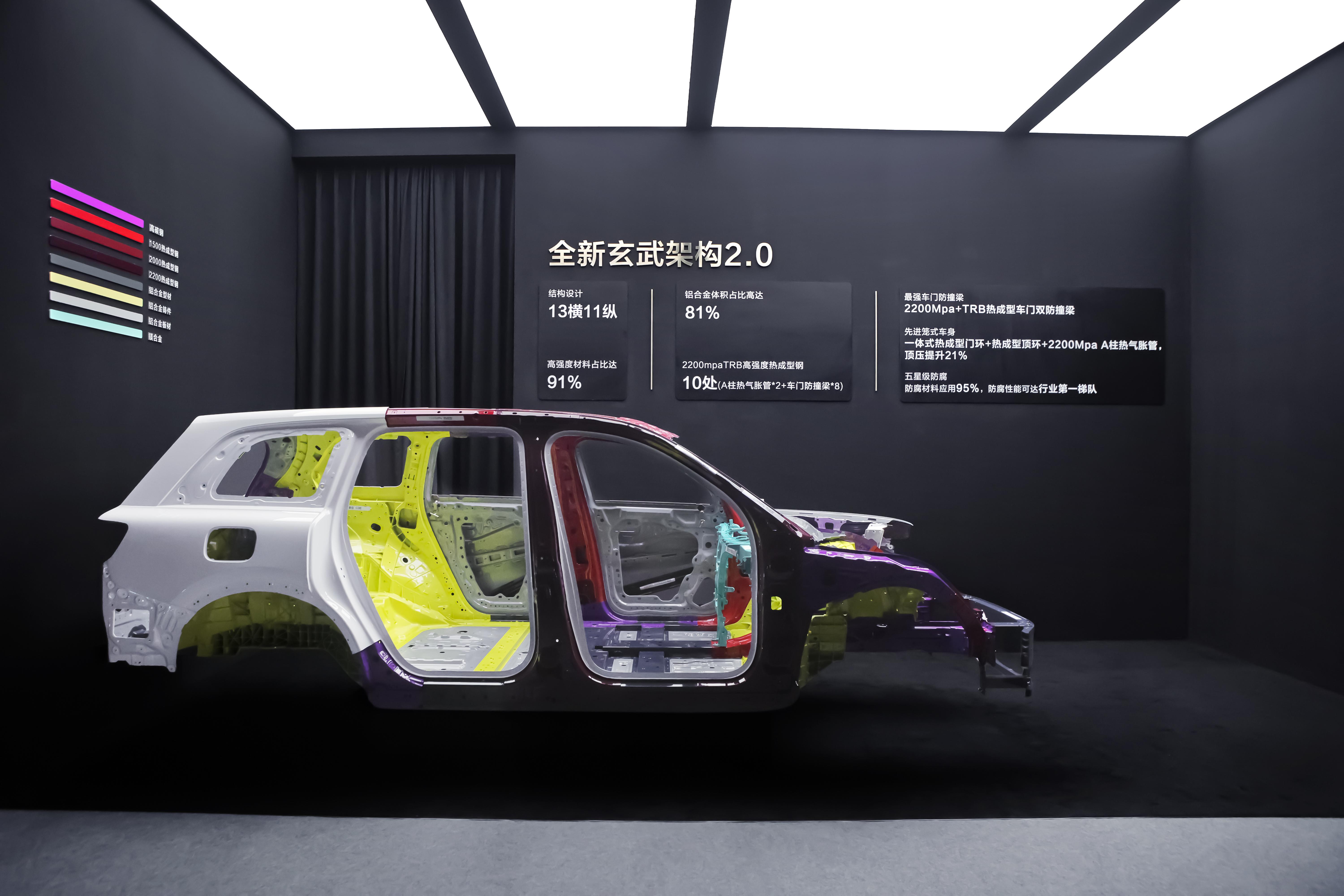 车身升级为玄武架构2.0,应用9800吨一体化压铸工艺与2200MPa超高强度热成型钢,铝合金体积占比达81%,最大顶压承受力可达16.9吨 。