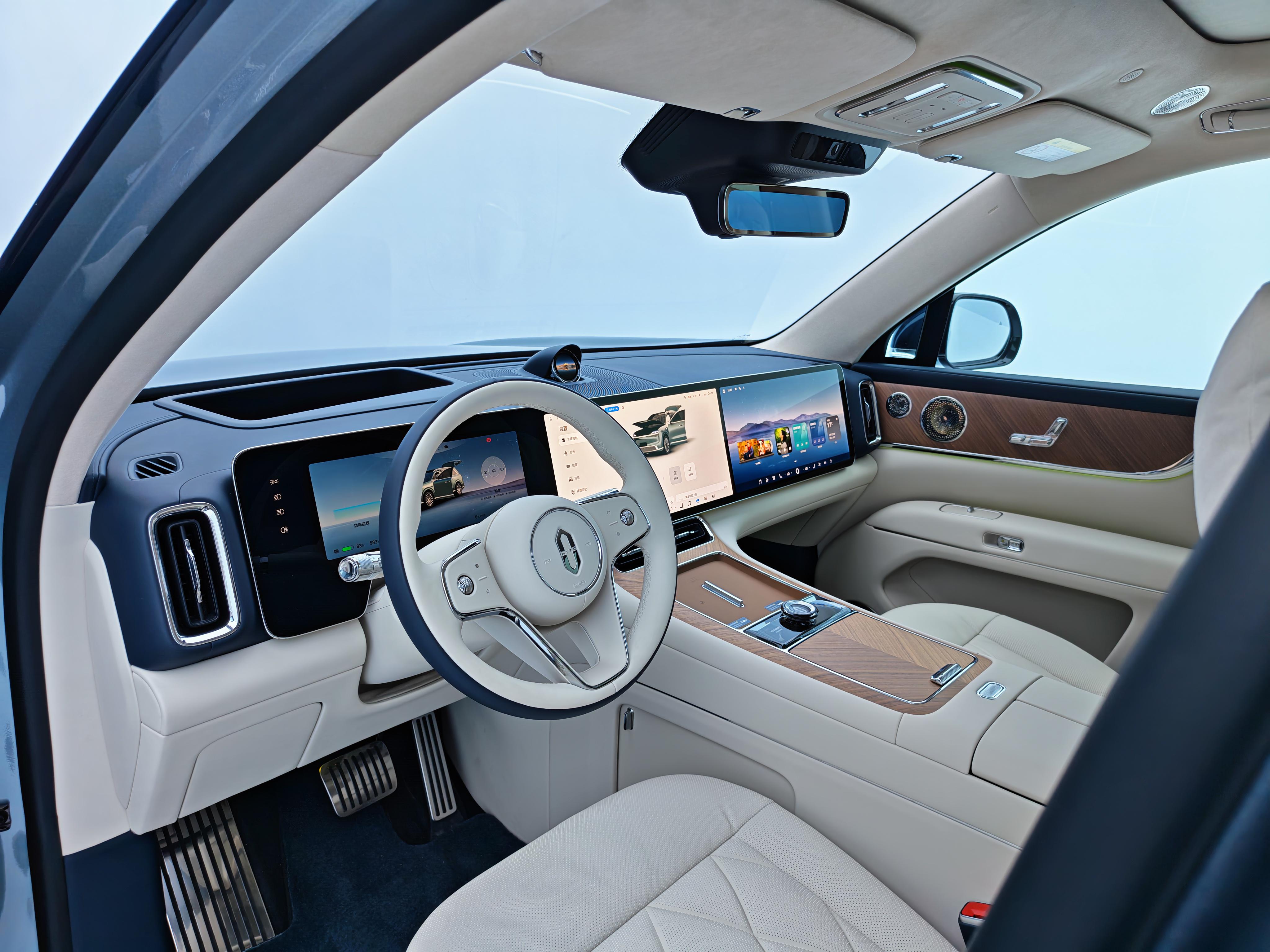 座舱内部,新车严格遵循中正对称的设计秩序,提供赤茶橘、韶华杏、松露棕、望月白、枫影红5种内饰配色。车内大面积采用Nappa真皮、实木材质以及水晶与真金属饰件,并全新引入了星寰岛动态旋转设计。