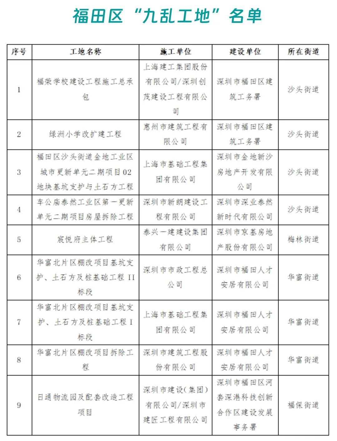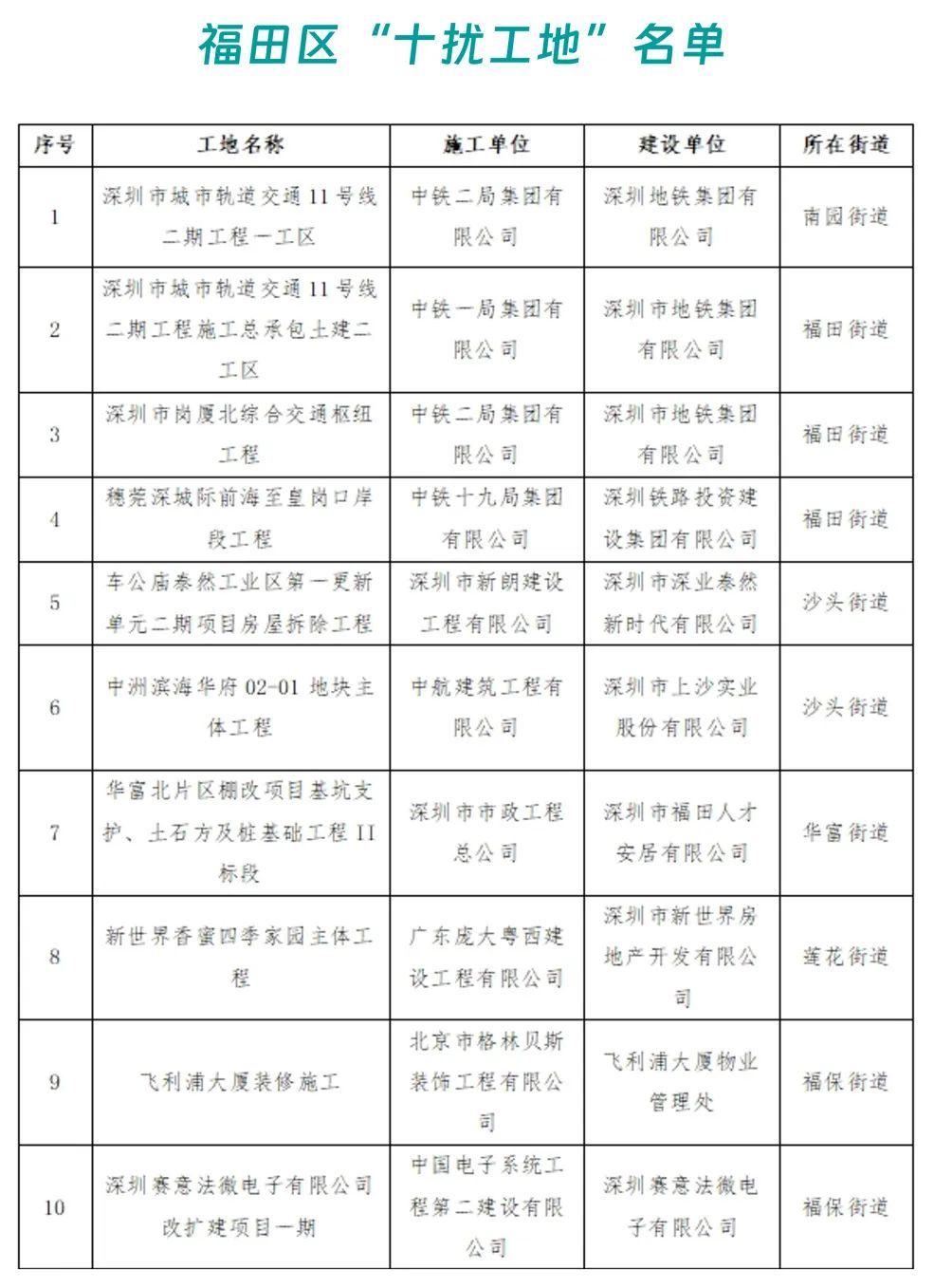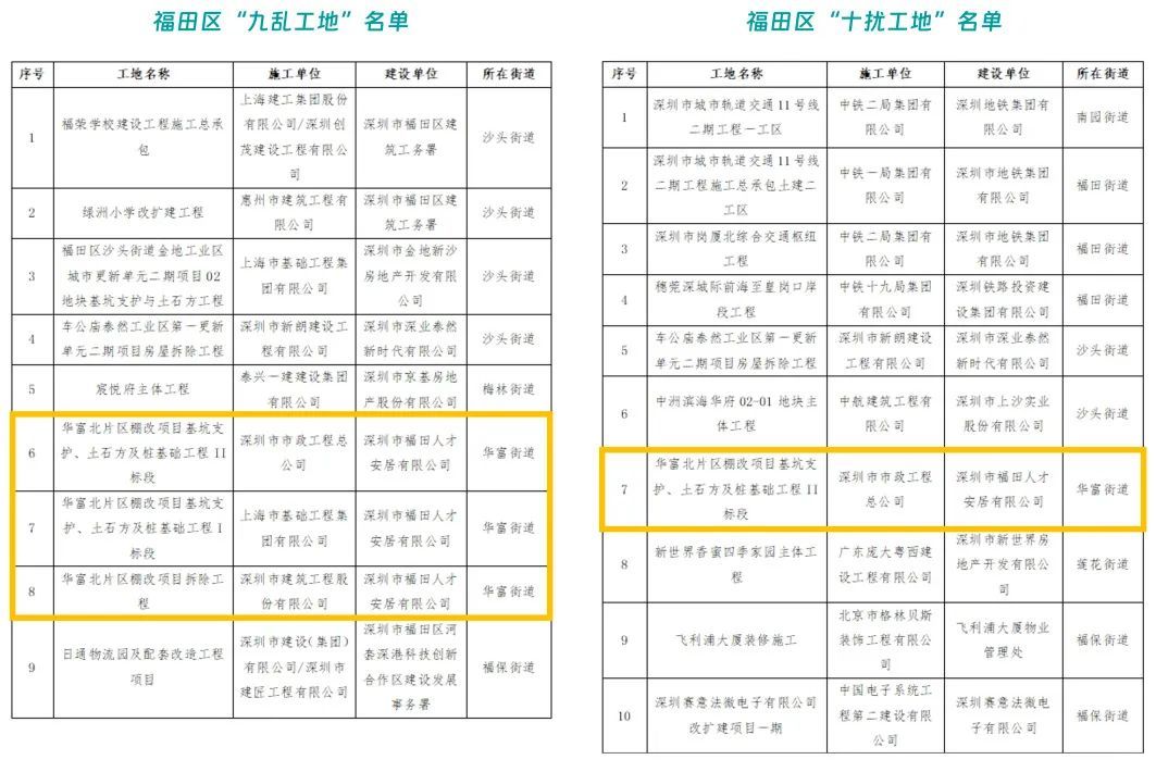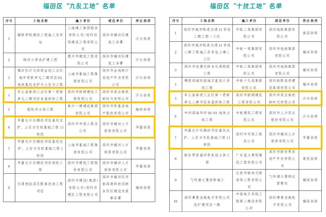车公庙泰然工业区第一更新单元二期项目房屋拆除工程及华富北片区棚改项目基坑支护、土石方及桩基础工程Ⅱ标段同时上榜扬尘污染“九乱工地”和噪音污染“十扰工地”。